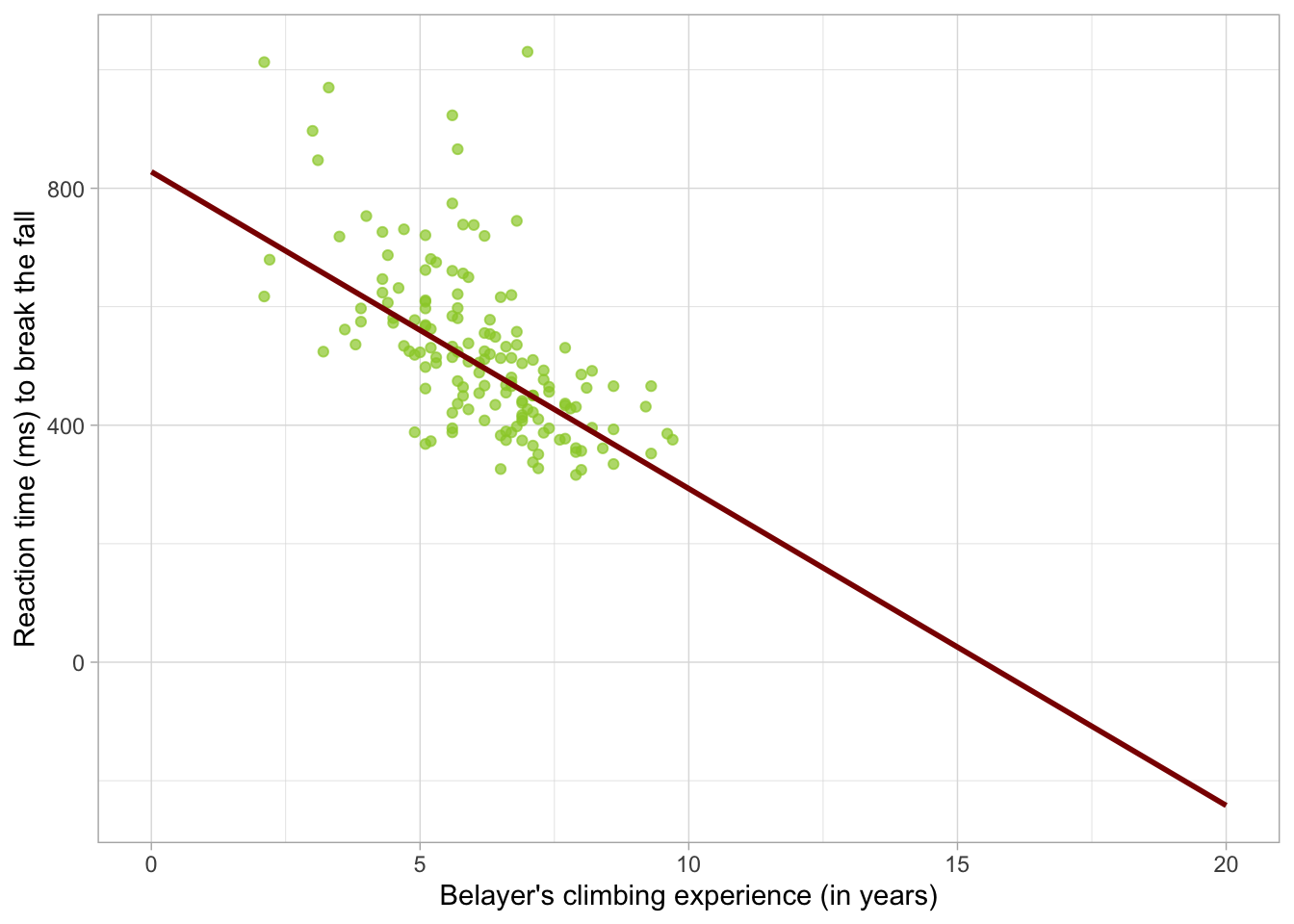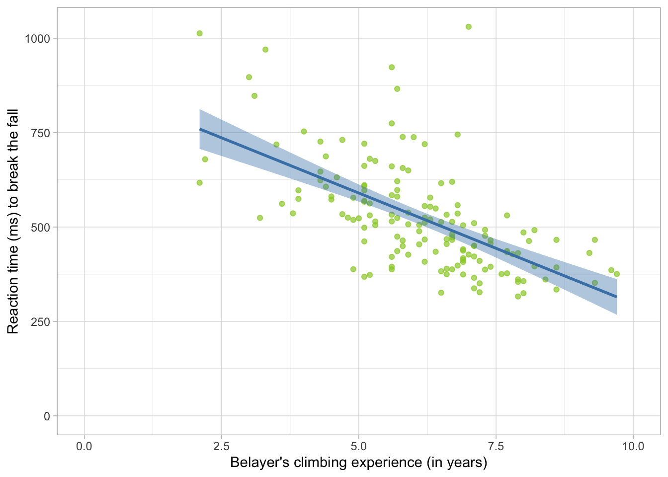 5  labs(x = "Belayer's climbing experience (in years)", y = "Reaction time (ms) to break the fall") +