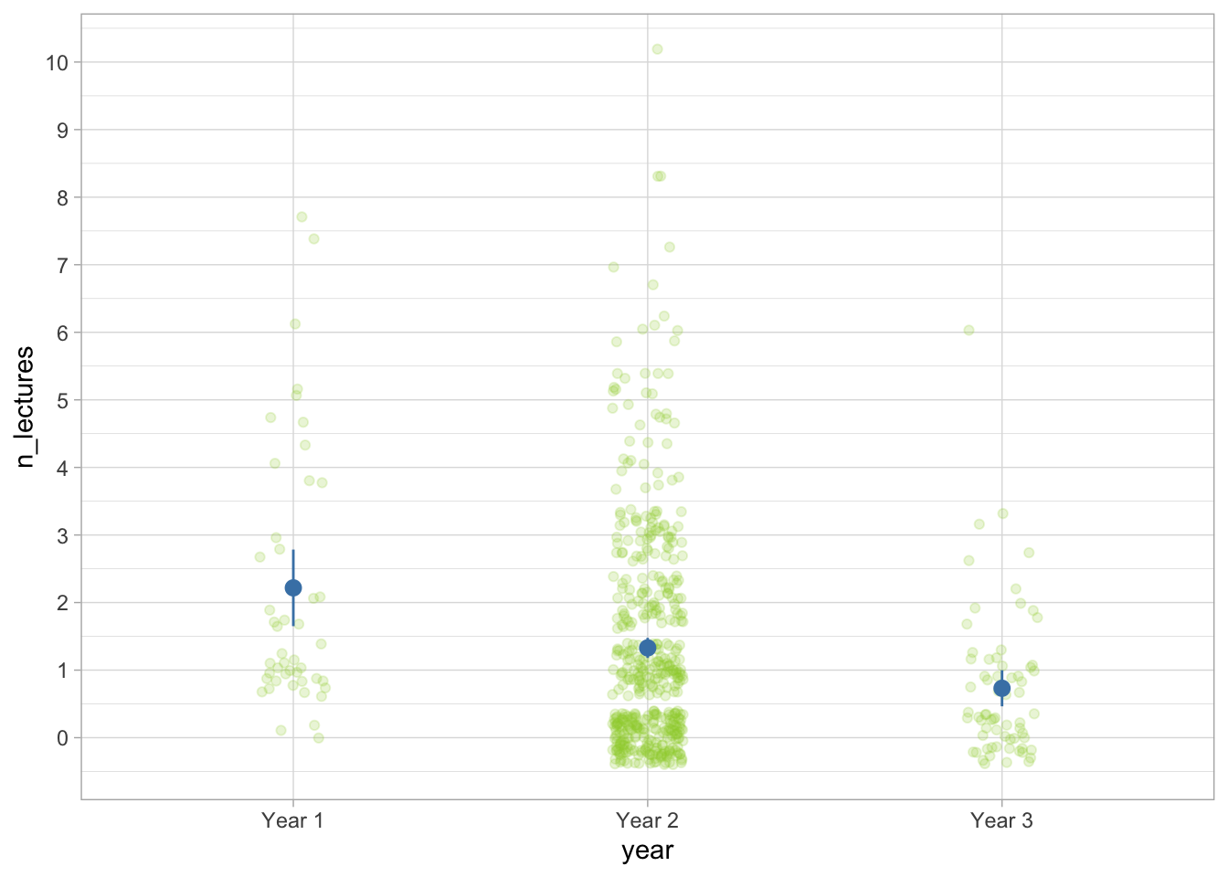 theme_light() ggplot2::ggplot(data = attend_tib, aes(x = year, y = n_lectures)) +
