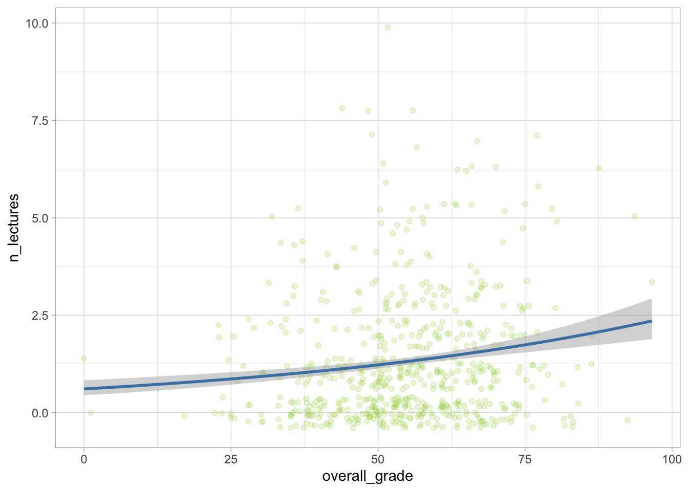 theme_light() ggplot2::ggplot(data = attend_tib, aes(x = overall_grade, y = n_lectures)) +