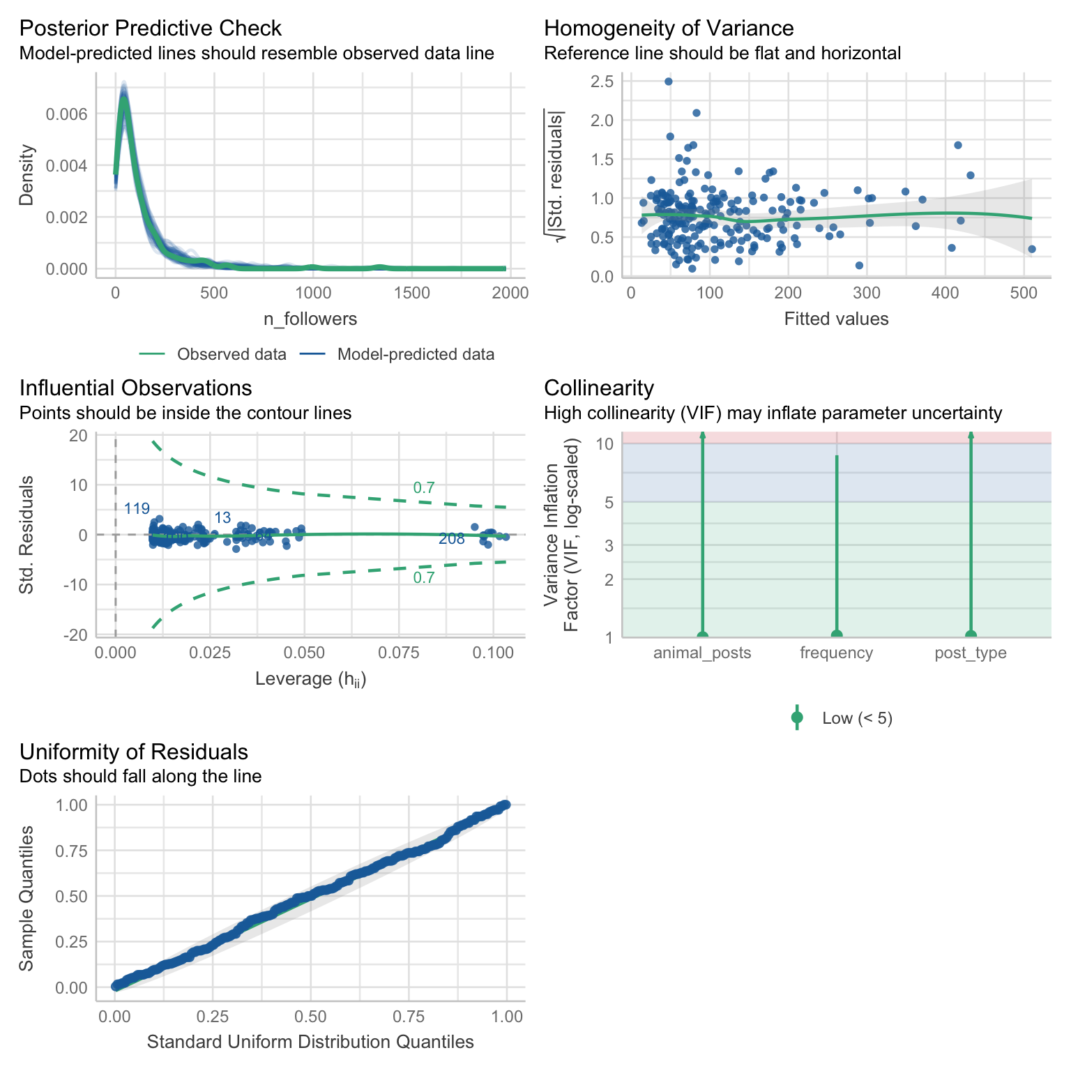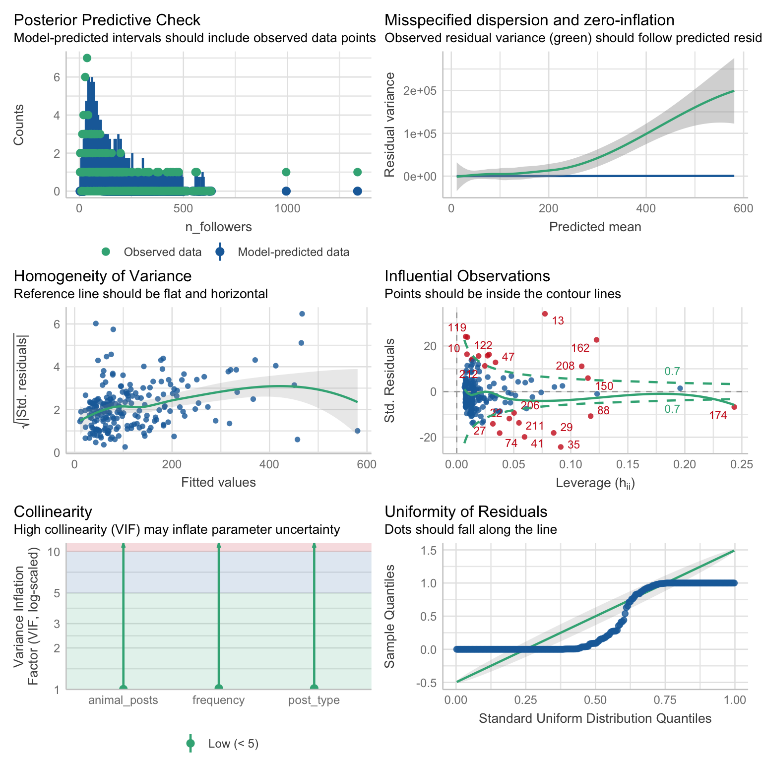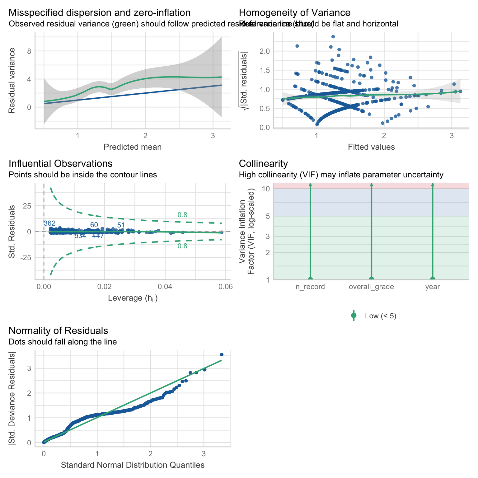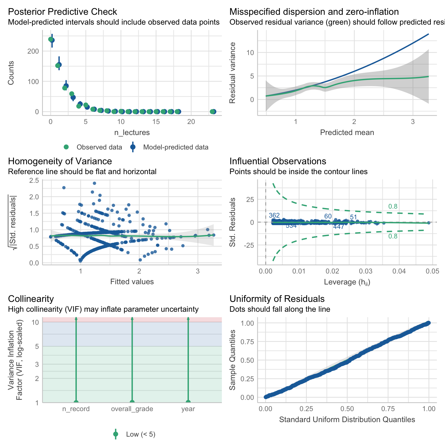 )check_model(attend_poiss)check_overdispersion(attend_poiss)nb_dist <- MASS::rnegbin(n = 1000, mu = 1, theta = 0.5)