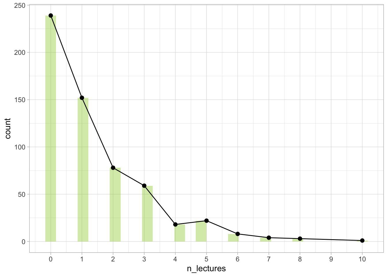 We can see that we have a right skewed distribution. Quite a lot of students did not attend any lectures at all or they went to just one. Very few participants attended 10 lectures, and no-one attended all of them (number 11 doesn’t even show up on the plot unless we force the plot to do so).