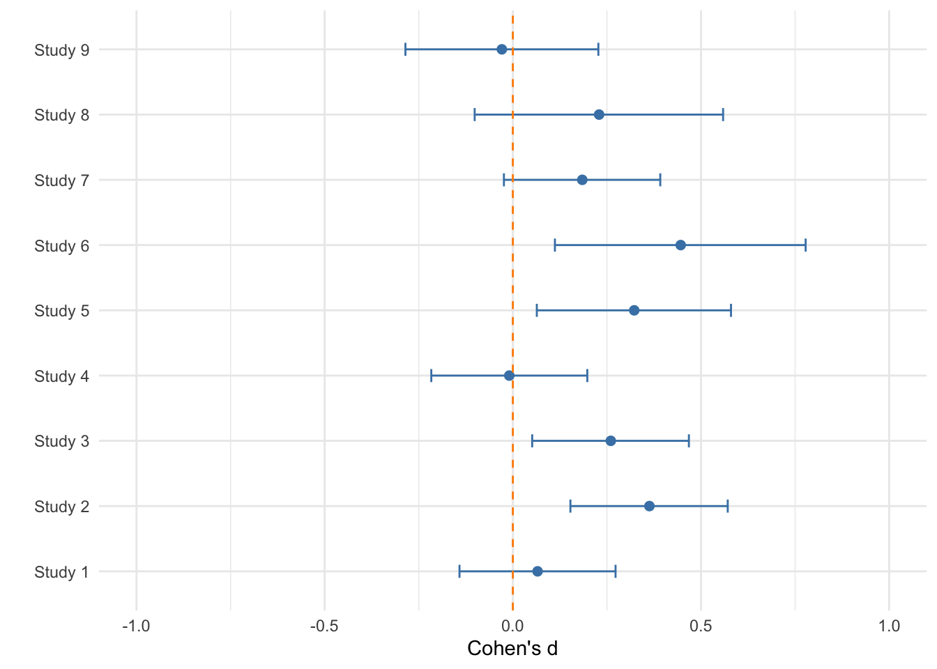 In the plot above, the dots represent the effect sizes from different studies and the error bars are their confidence intervals. We can see that the majority of the studies indicate a positive difference (lecturers doom-scroll more than students), but several of the confidence intervals include zero as well as negative values.